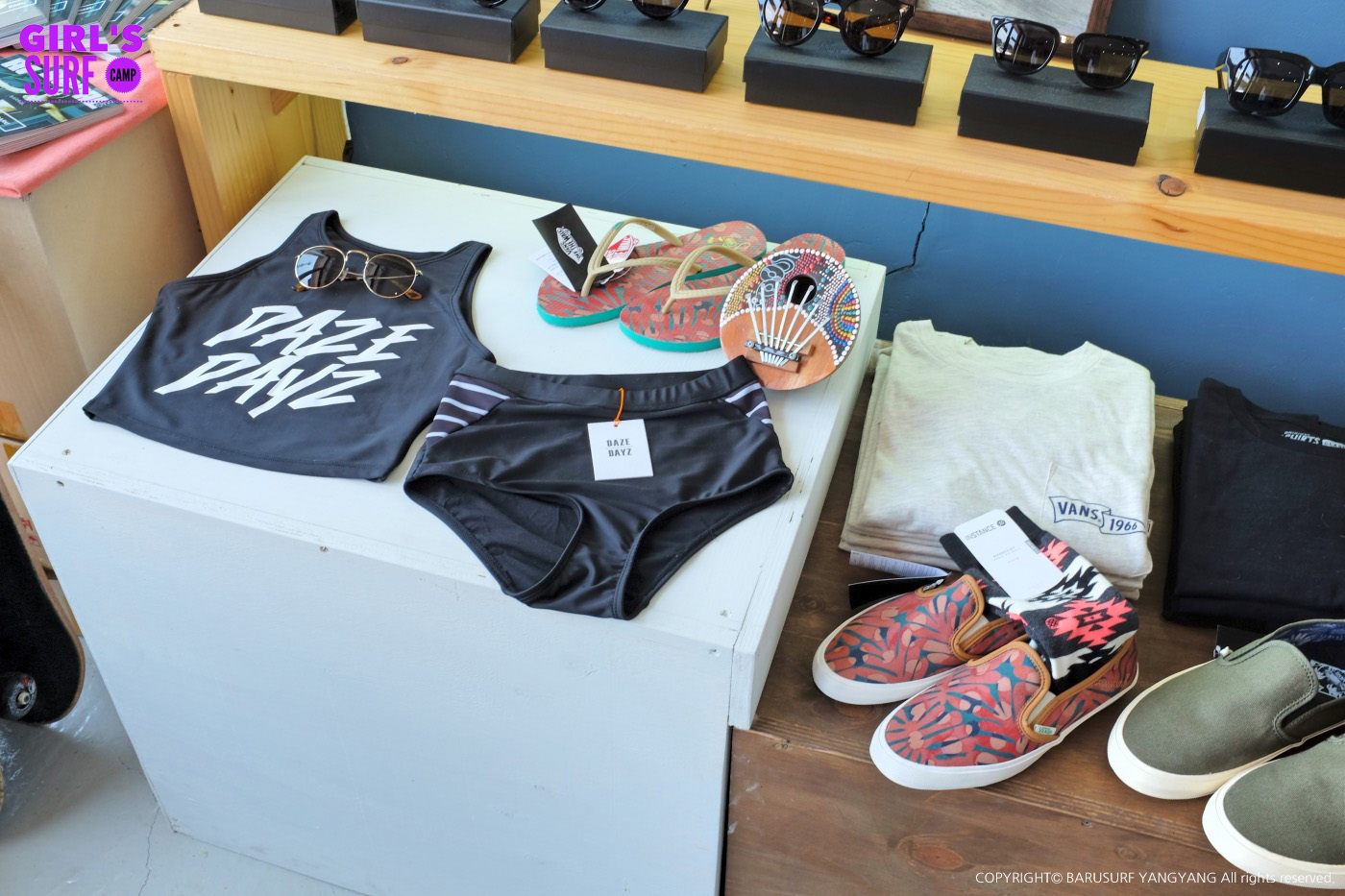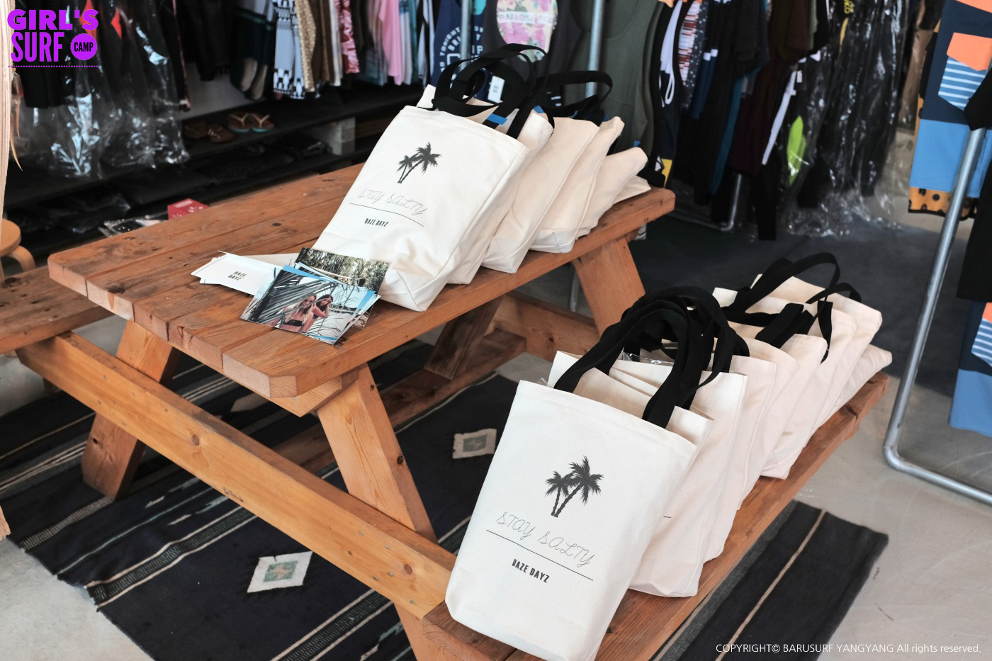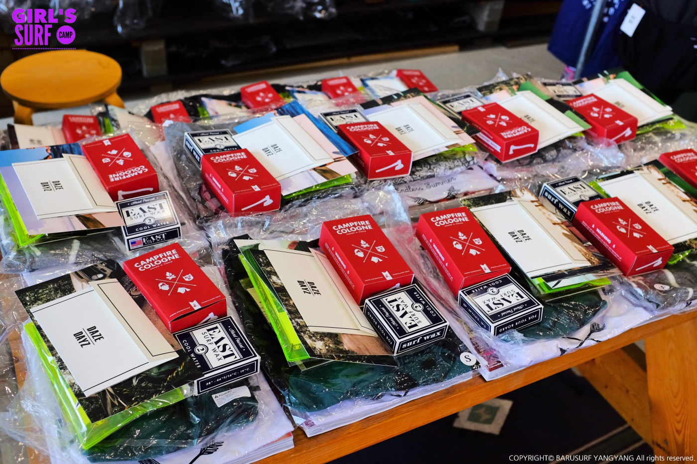 DAZEDAYZ의 래쉬가드와 엽서, 서프코드의 캠프콜롱과 이스트왁스, GRAVIS의 샌들과 스티커팩, ABBAMART의 BELLEME 징카 선스틱과 워터프루프라이너,