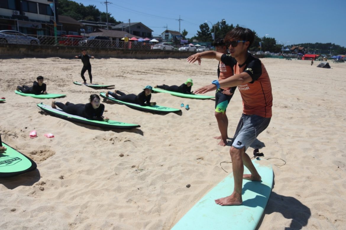 서핑을 하기 위해 기본적으로 알아야 할 안전수칙, 바다의 이해에 대한 이론수업을 마친 후 인스트럭터의 도움을 받아 보드위에 정확한 자세로 일어나는 법과 해변을 향해 일직선으로 라이딩 하는 법을 배운다.
